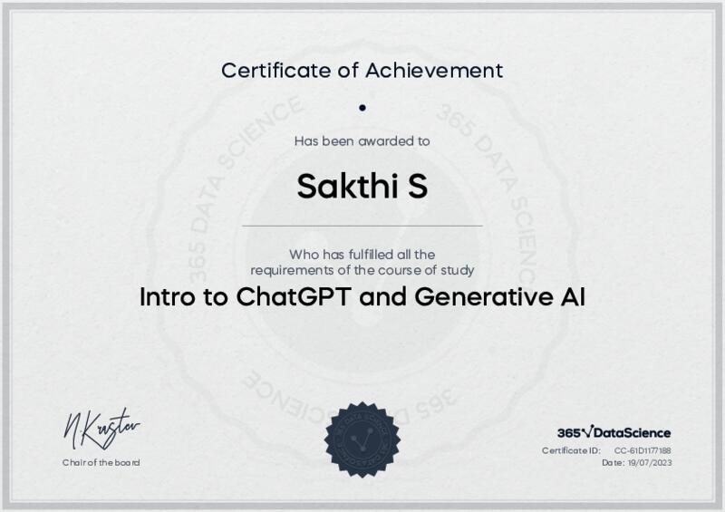 This user has been awarded the Intro to ChatGPT and Generative AI Certificate for successfully completing the course exam. Holding this certificate demonstrates their proficiency on the topic and signifies they are qualified to apply their newly acquired expertise in the fields of data analytics and data science.