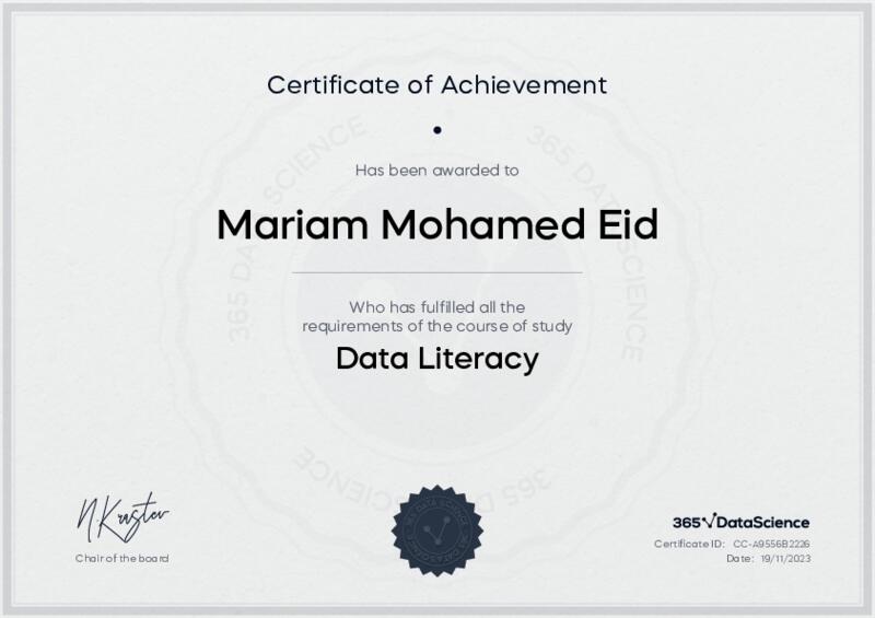 This user has been awarded the Data Literacy Certificate for successfully completing the course exam. Holding this certificate demonstrates their proficiency on the topic and signifies they are qualified to apply their newly acquired expertise in the fields of data analytics and data science.