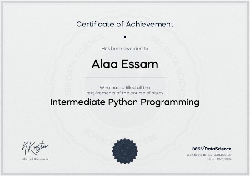 This user has been awarded the Intermediate Python Programming Certificate for successfully completing the course exam. Holding this certificate demonstrates their proficiency on the topic and signifies they are qualified to apply their newly acquired expertise in the fields of data analytics and data science.