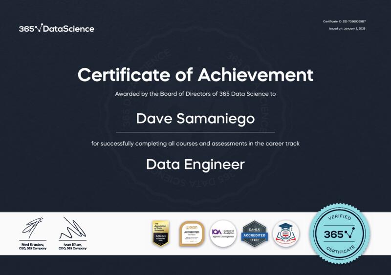 This user has been awarded the Data Engineer Career Track Certificate for successfully completing all courses and assessments. This certificate confirms their technical expertise and professional credibility to work as a data engineer.