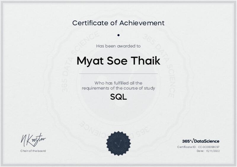 This user has been awarded the SQL Certificate for successfully completing the course exam. Holding this certificate demonstrates their proficiency on the topic and signifies they are qualified to apply their newly acquired expertise in the fields of data analytics and data science.