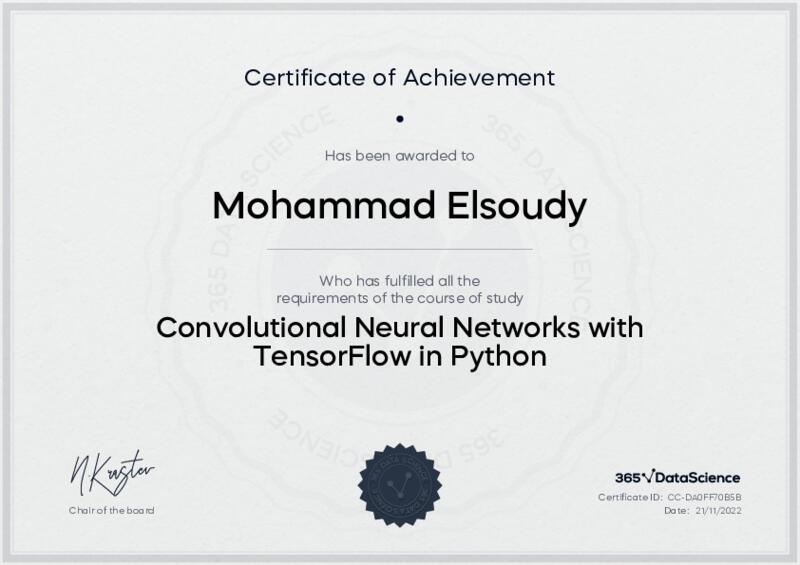 This user has been awarded the Convolutional Neural Networks with TensorFlow in Python Certificate for successfully completing the course exam. Holding this certificate demonstrates their proficiency on the topic and signifies they are qualified to apply their newly acquired expertise in the fields of data analytics and data science.