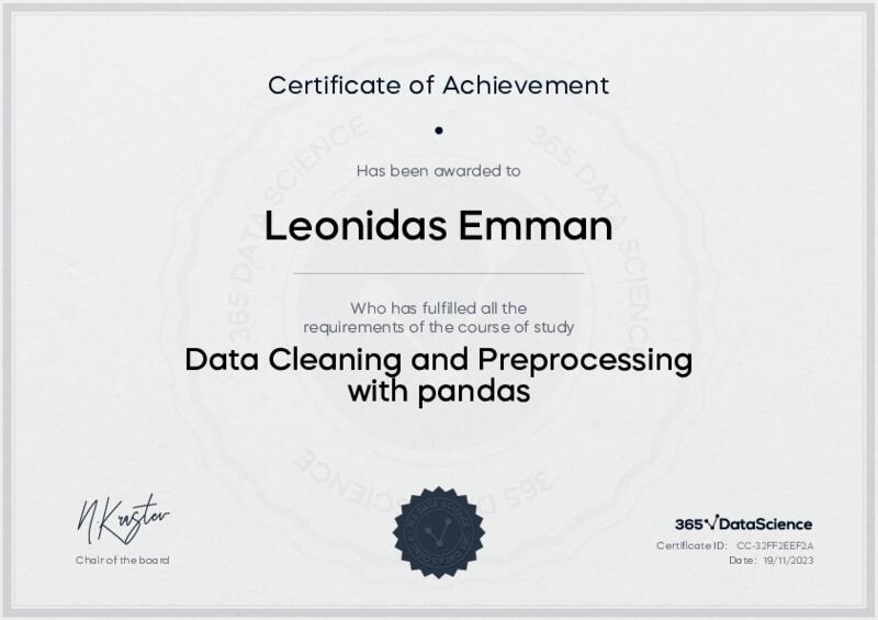 This user has been awarded the Data Cleaning and Preprocessing with pandas Certificate for successfully completing the course exam. Holding this certificate demonstrates their proficiency on the topic and signifies they are qualified to apply their newly acquired expertise in the fields of data analytics and data science.