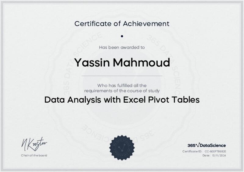 This user has been awarded the Data Analysis with Excel Pivot Tables Certificate for successfully completing the course exam. Holding this certificate demonstrates their proficiency on the topic and signifies they are qualified to apply their newly acquired expertise in the fields of data analytics and data science.