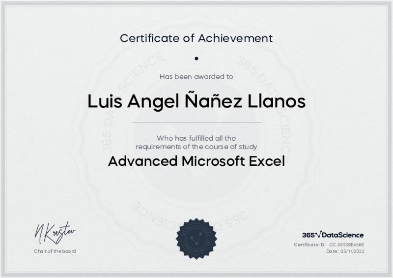This user has been awarded the Advanced Microsoft Excel Certificate for successfully completing the course exam. Holding this certificate demonstrates their proficiency on the topic and signifies they are qualified to apply their newly acquired expertise in the fields of data analytics and data science.
