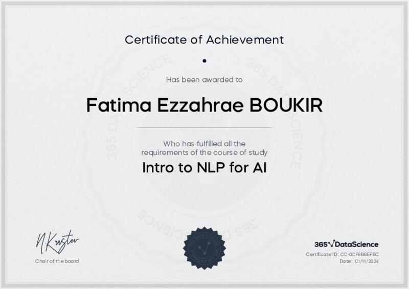 This user has been awarded the Intro to NLP for AI Certificate for successfully completing the course exam. Holding this certificate demonstrates their proficiency on the topic and signifies they are qualified to apply their newly acquired expertise in the fields of data analytics and data science.