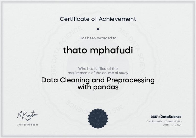 This user has been awarded the Data Cleaning and Preprocessing with pandas Certificate for successfully completing the course exam. Holding this certificate demonstrates their proficiency on the topic and signifies they are qualified to apply their newly acquired expertise in the fields of data analytics and data science.
