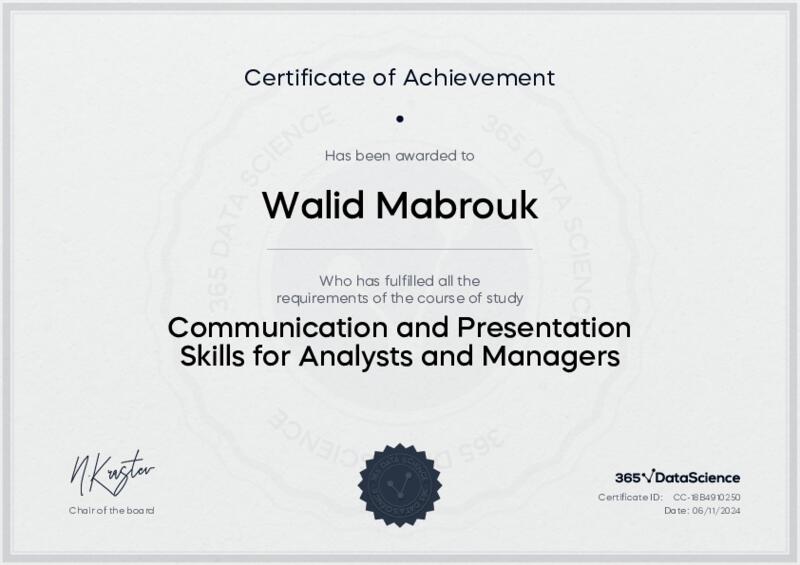 This user has been awarded the Communication and Presentation Skills for Analysts and Managers Certificate for successfully completing the course exam. Holding this certificate demonstrates their proficiency on the topic and signifies they are qualified to apply their newly acquired expertise in the fields of data analytics and data science.