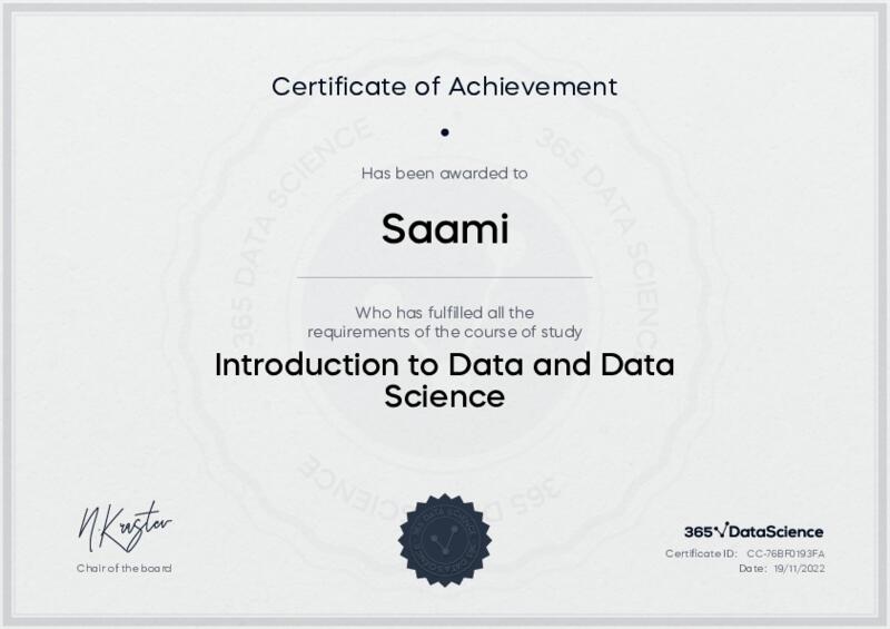 This user has been awarded the Introduction to Data and Data Science Certificate for successfully completing the course exam. Holding this certificate demonstrates their proficiency on the topic and signifies they are qualified to apply their newly acquired expertise in the fields of data analytics and data science.