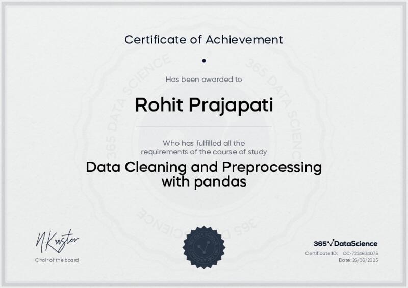 This user has been awarded the Data Cleaning and Preprocessing with pandas Certificate for successfully completing the course exam. Holding this certificate demonstrates their proficiency on the topic and signifies they are qualified to apply their newly acquired expertise in the fields of data analytics and data science.