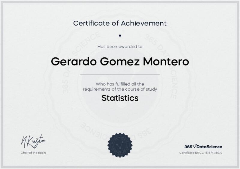 This user has been awarded the Statistics Certificate for successfully completing the course exam. Holding this certificate demonstrates their proficiency on the topic and signifies they are qualified to apply their newly acquired expertise in the fields of data analytics and data science.
