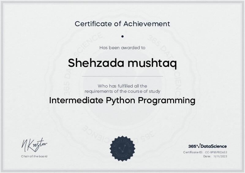 This user has been awarded the Intermediate Python Programming Certificate for successfully completing the course exam. Holding this certificate demonstrates their proficiency on the topic and signifies they are qualified to apply their newly acquired expertise in the fields of data analytics and data science.