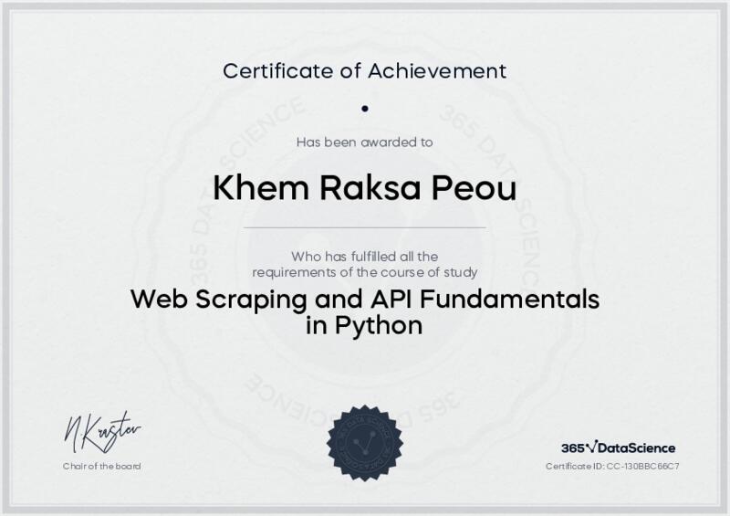This user has been awarded the Web Scraping and API Fundamentals in Python Certificate for successfully completing the course exam. Holding this certificate demonstrates their proficiency on the topic and signifies they are qualified to apply their newly acquired expertise in the fields of data analytics and data science.
