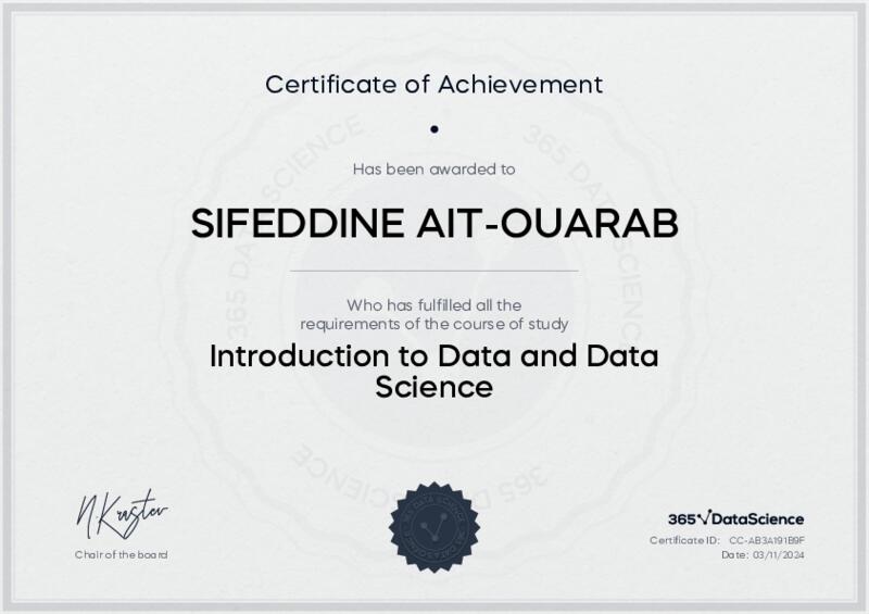This user has been awarded the Introduction to Data and Data Science Certificate for successfully completing the course exam. Holding this certificate demonstrates their proficiency on the topic and signifies they are qualified to apply their newly acquired expertise in the fields of data analytics and data science.