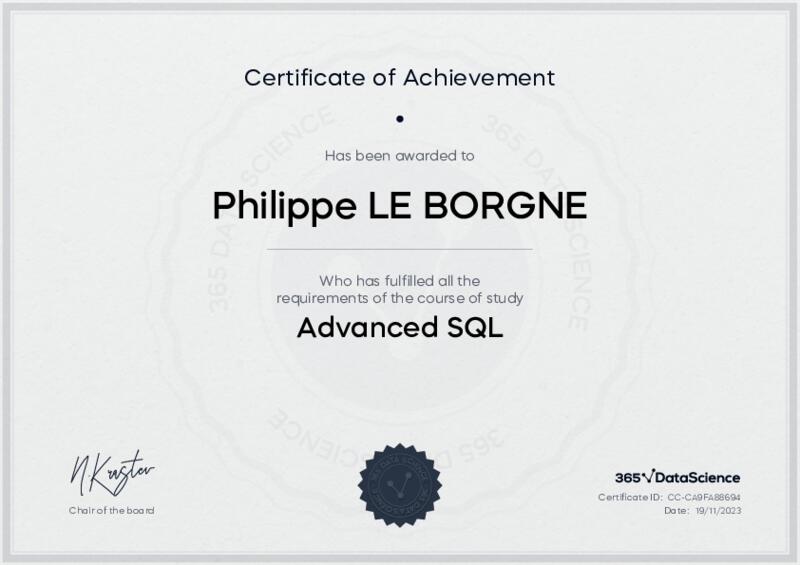 This user has been awarded the Advanced SQL Certificate for successfully completing the course exam. Holding this certificate demonstrates their proficiency on the topic and signifies they are qualified to apply their newly acquired expertise in the fields of data analytics and data science.