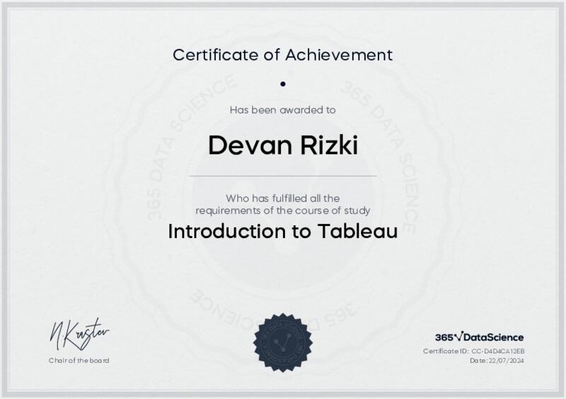 This user has been awarded the Introduction to Tableau Certificate for successfully completing the course exam. Holding this certificate demonstrates their proficiency on the topic and signifies they are qualified to apply their newly acquired expertise in the fields of data analytics and data science.