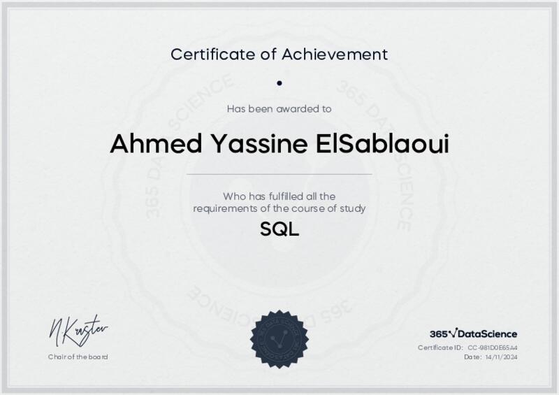 This user has been awarded the SQL Certificate for successfully completing the course exam. Holding this certificate demonstrates their proficiency on the topic and signifies they are qualified to apply their newly acquired expertise in the fields of data analytics and data science.