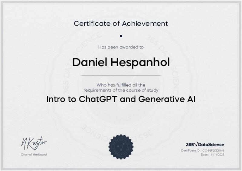 This user has been awarded the Intro to ChatGPT and Generative AI Certificate for successfully completing the course exam. Holding this certificate demonstrates their proficiency on the topic and signifies they are qualified to apply their newly acquired expertise in the fields of data analytics and data science.