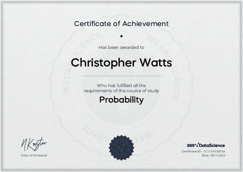 This user has been awarded the Probability Certificate for successfully completing the course exam. Holding this certificate demonstrates their proficiency on the topic and signifies they are qualified to apply their newly acquired expertise in the fields of data analytics and data science.