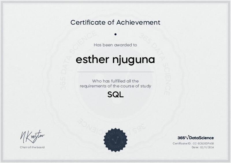 This user has been awarded the SQL Certificate for successfully completing the course exam. Holding this certificate demonstrates their proficiency on the topic and signifies they are qualified to apply their newly acquired expertise in the fields of data analytics and data science.
