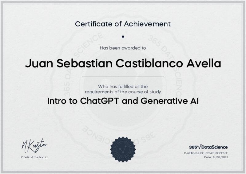 This user has been awarded the Intro to ChatGPT and Generative AI Certificate for successfully completing the course exam. Holding this certificate demonstrates their proficiency on the topic and signifies they are qualified to apply their newly acquired expertise in the fields of data analytics and data science.