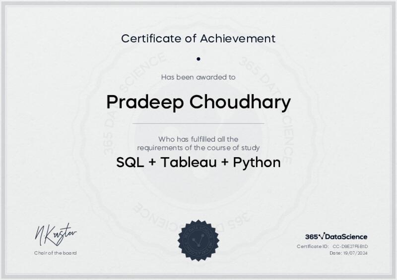 This user has been awarded the SQL + Tableau + Python Certificate for successfully completing the course exam. Holding this certificate demonstrates their proficiency on the topic and signifies they are qualified to apply their newly acquired expertise in the fields of data analytics and data science.