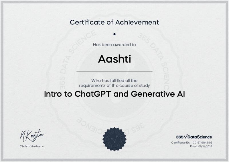 This user has been awarded the Intro to ChatGPT and Generative AI Certificate for successfully completing the course exam. Holding this certificate demonstrates their proficiency on the topic and signifies they are qualified to apply their newly acquired expertise in the fields of data analytics and data science.