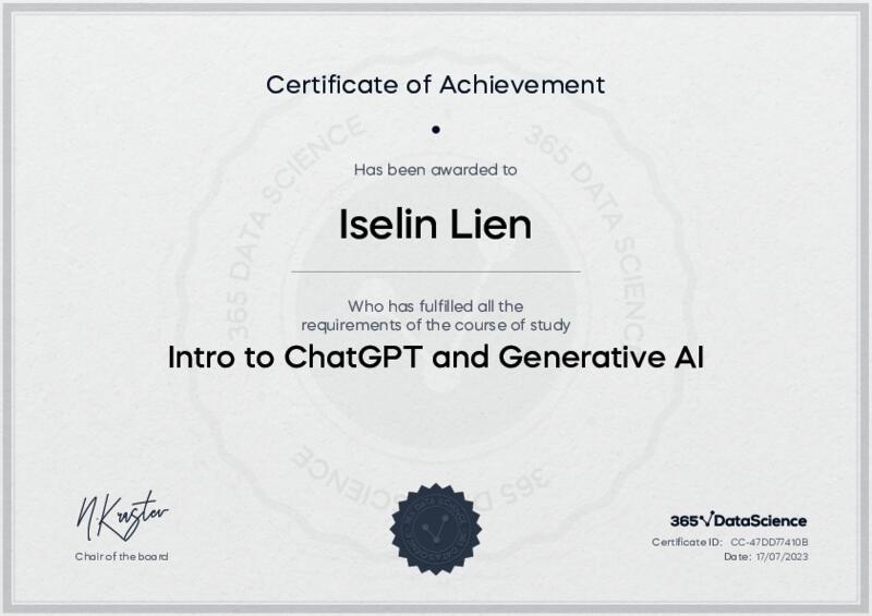 This user has been awarded the Intro to ChatGPT and Generative AI Certificate for successfully completing the course exam. Holding this certificate demonstrates their proficiency on the topic and signifies they are qualified to apply their newly acquired expertise in the fields of data analytics and data science.