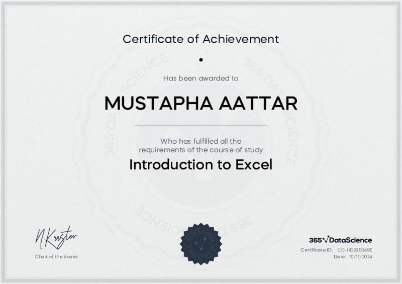 This user has been awarded the Introduction to Excel Certificate for successfully completing the course exam. Holding this certificate demonstrates their proficiency on the topic and signifies they are qualified to apply their newly acquired expertise in the fields of data analytics and data science.