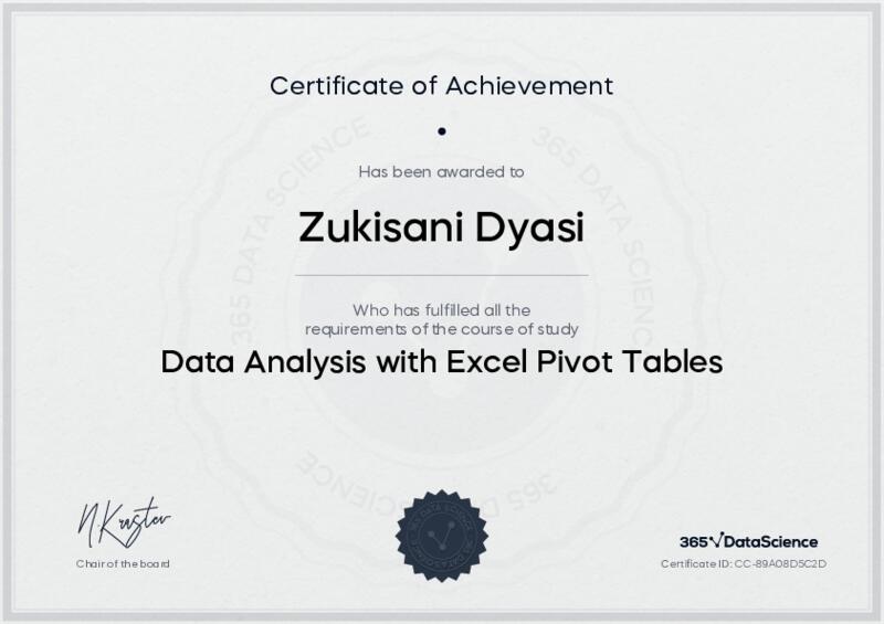 This user has been awarded the Data Analysis with Excel Pivot Tables Certificate for successfully completing the course exam. Holding this certificate demonstrates their proficiency on the topic and signifies they are qualified to apply their newly acquired expertise in the fields of data analytics and data science.