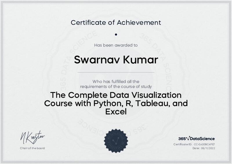 This user has been awarded the The Complete Data Visualization Course with Python, R, Tableau, and Excel Certificate for successfully completing the course exam. Holding this certificate demonstrates their proficiency on the topic and signifies they are qualified to apply their newly acquired expertise in the fields of data analytics and data science.