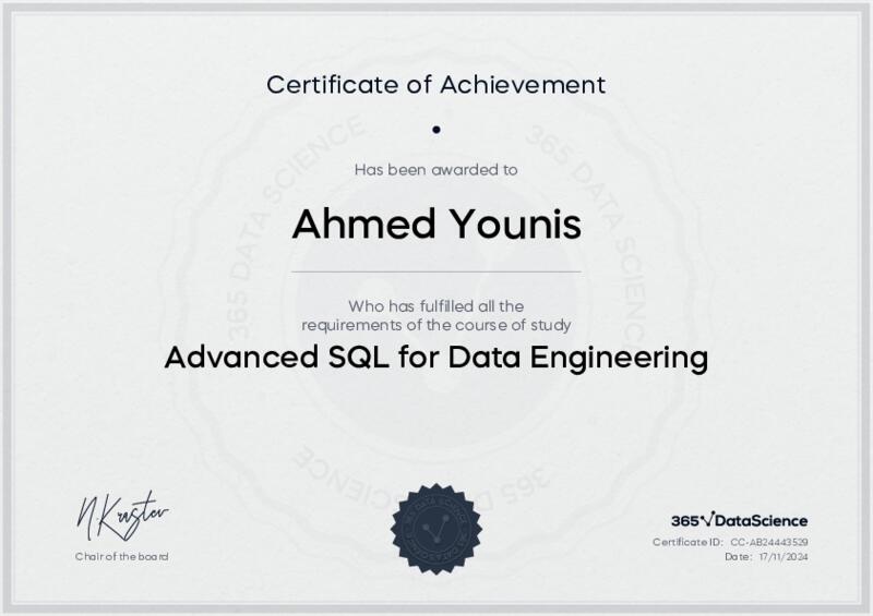 This user has been awarded the Advanced SQL for Data Engineering Certificate for successfully completing the course exam. Holding this certificate demonstrates their proficiency on the topic and signifies they are qualified to apply their newly acquired expertise in the fields of data analytics and data science.