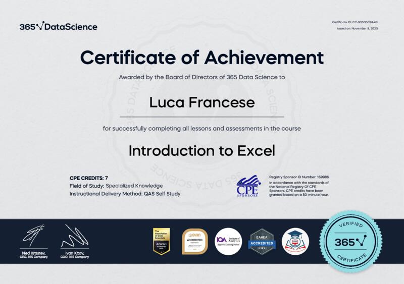 This user has been awarded the Introduction to Excel Certificate for successfully completing the course exam. Holding this certificate demonstrates their proficiency on the topic and signifies they are qualified to apply their newly acquired expertise in the fields of data analytics and data science.