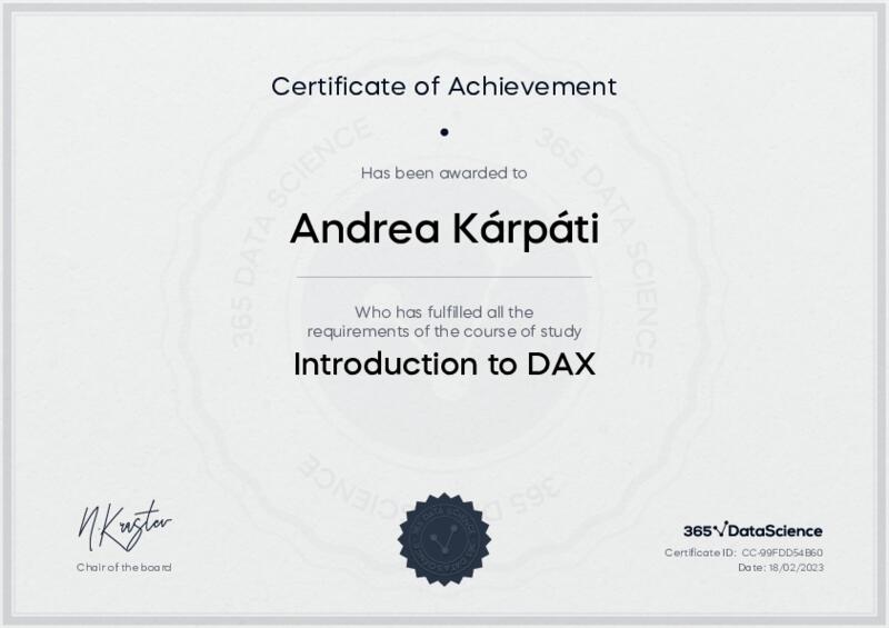 This user has been awarded the Introduction to DAX Certificate for successfully completing the course exam. Holding this certificate demonstrates their proficiency on the topic and signifies they are qualified to apply their newly acquired expertise in the fields of data analytics and data science.