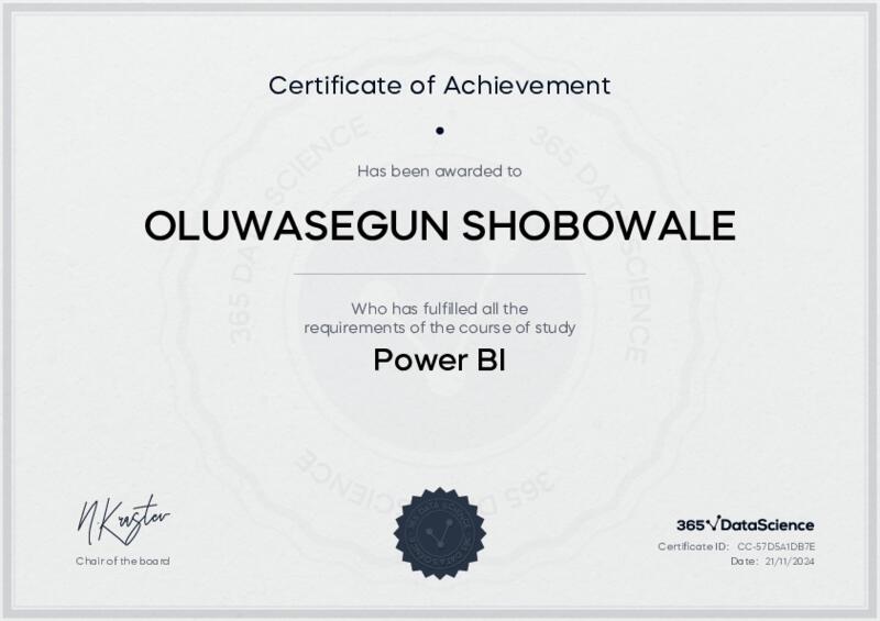 This user has been awarded the Power BI Certificate for successfully completing the course exam. Holding this certificate demonstrates their proficiency on the topic and signifies they are qualified to apply their newly acquired expertise in the fields of data analytics and data science.