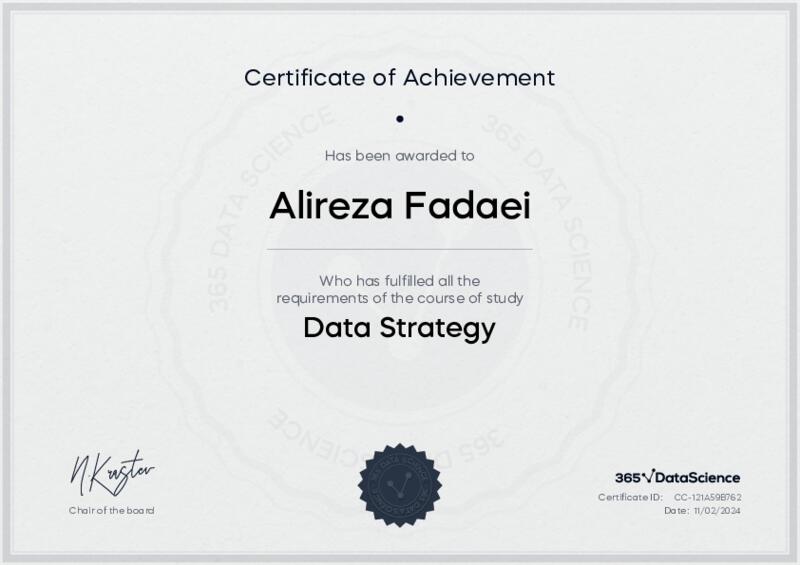 This user has been awarded the Data Strategy Certificate for successfully completing the course exam. Holding this certificate demonstrates their proficiency on the topic and signifies they are qualified to apply their newly acquired expertise in the fields of data analytics and data science.