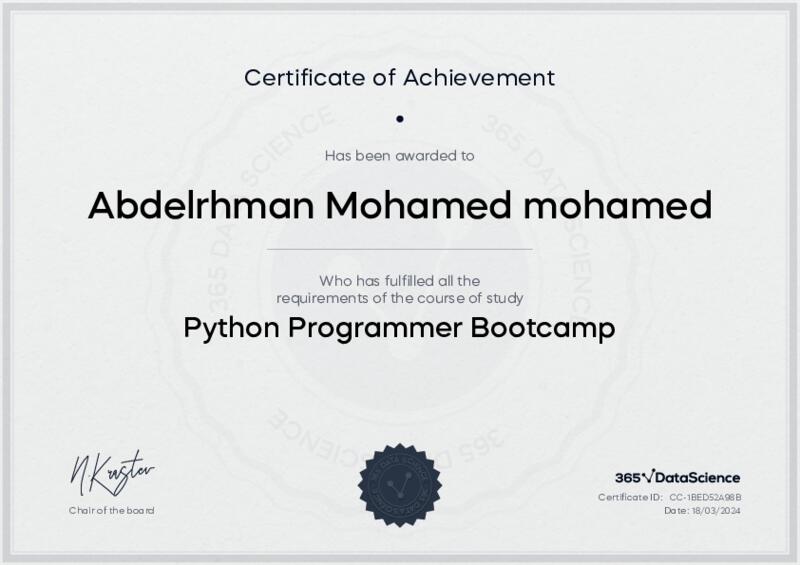 This user has been awarded the Python Programmer Bootcamp Certificate for successfully completing the course exam. Holding this certificate demonstrates their proficiency on the topic and signifies they are qualified to apply their newly acquired expertise in the fields of data analytics and data science.