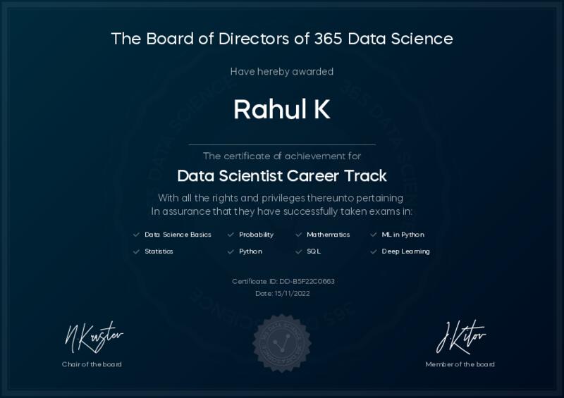 This user has been awarded the Data Scientist Career Track Certificate for successfully completing all courses and assessments. This certificate confirms their technical expertise and professional credibility to work as a data scientist.