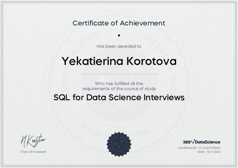 This user has been awarded the SQL for Data Science Interviews Certificate for successfully completing the course exam. Holding this certificate demonstrates their proficiency on the topic and signifies they are qualified to apply their newly acquired expertise in the fields of data analytics and data science.