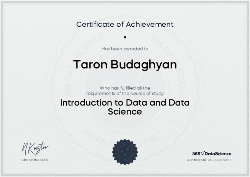 This user has been awarded the Introduction to Data and Data Science Certificate for successfully completing the course exam. Holding this certificate demonstrates their proficiency on the topic and signifies they are qualified to apply their newly acquired expertise in the fields of data analytics and data science.