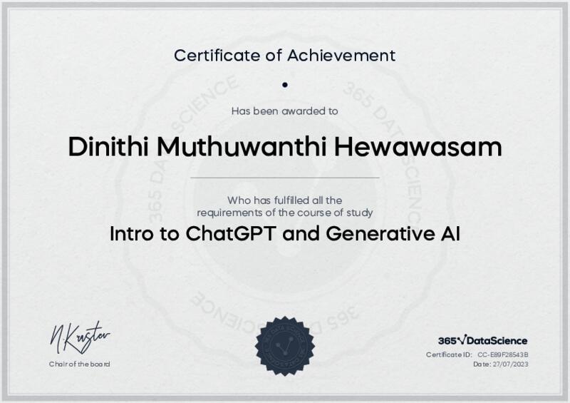 This user has been awarded the Intro to ChatGPT and Generative AI Certificate for successfully completing the course exam. Holding this certificate demonstrates their proficiency on the topic and signifies they are qualified to apply their newly acquired expertise in the fields of data analytics and data science.