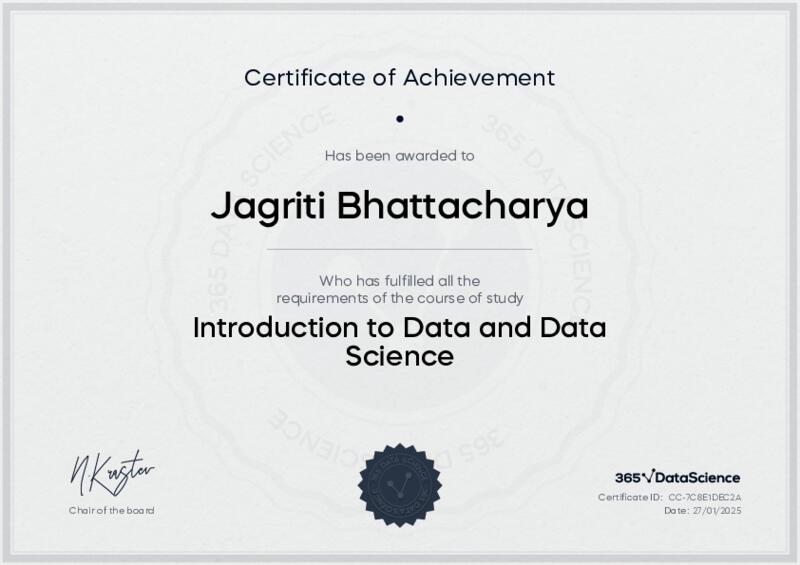 This user has been awarded the Introduction to Data and Data Science Certificate for successfully completing the course exam. Holding this certificate demonstrates their proficiency on the topic and signifies they are qualified to apply their newly acquired expertise in the fields of data analytics and data science.
