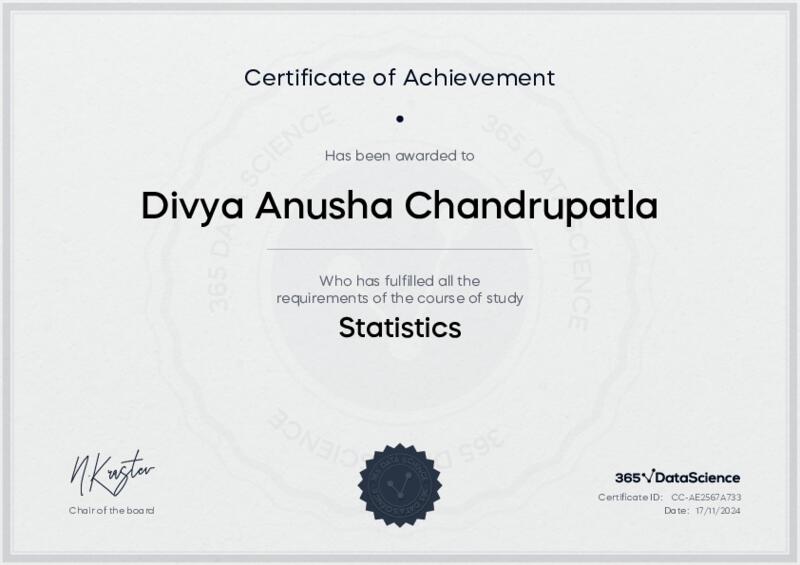 This user has been awarded the Statistics Certificate for successfully completing the course exam. Holding this certificate demonstrates their proficiency on the topic and signifies they are qualified to apply their newly acquired expertise in the fields of data analytics and data science.