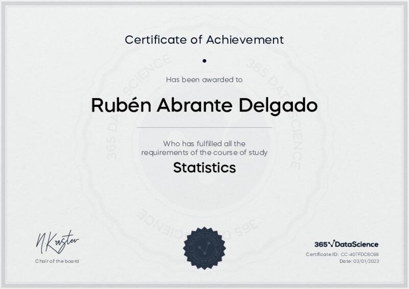 This user has been awarded the Statistics Certificate for successfully completing the course exam. Holding this certificate demonstrates their proficiency on the topic and signifies they are qualified to apply their newly acquired expertise in the fields of data analytics and data science.