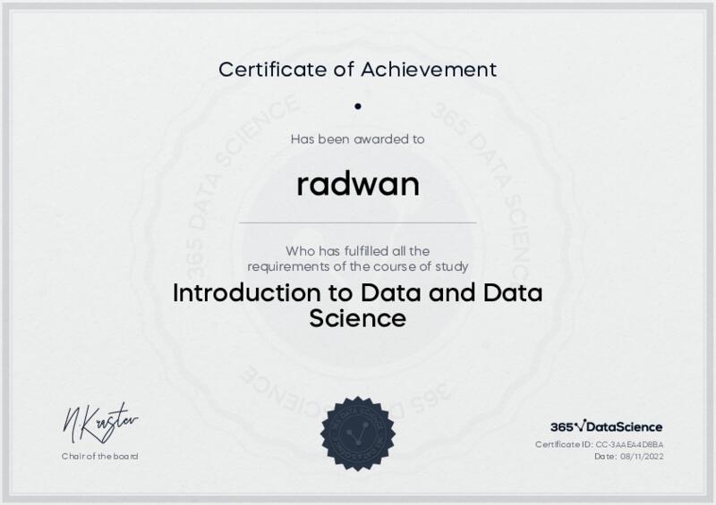 This user has been awarded the Introduction to Data and Data Science Certificate for successfully completing the course exam. Holding this certificate demonstrates their proficiency on the topic and signifies they are qualified to apply their newly acquired expertise in the fields of data analytics and data science.
