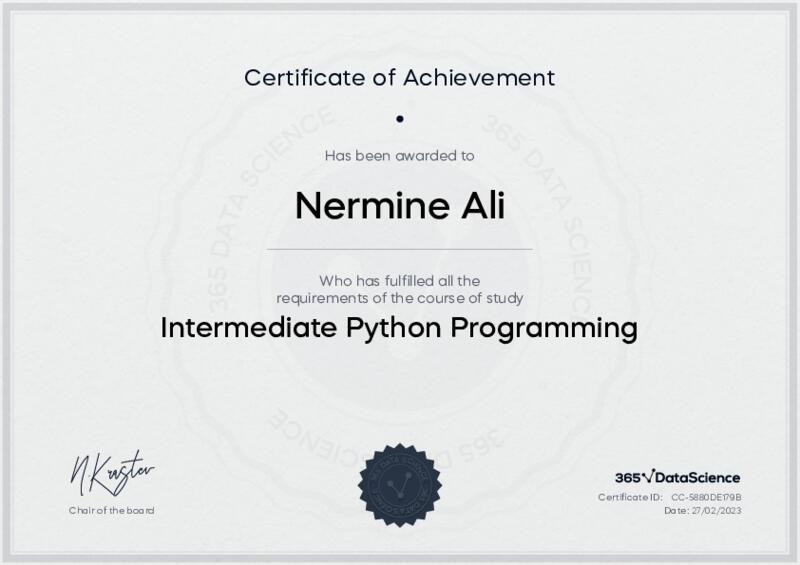 This user has been awarded the Intermediate Python Programming Certificate for successfully completing the course exam. Holding this certificate demonstrates their proficiency on the topic and signifies they are qualified to apply their newly acquired expertise in the fields of data analytics and data science.