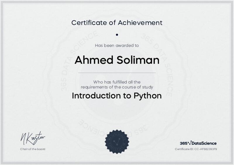 This user has been awarded the Introduction to Python Certificate for successfully completing the course exam. Holding this certificate demonstrates their proficiency on the topic and signifies they are qualified to apply their newly acquired expertise in the fields of data analytics and data science.