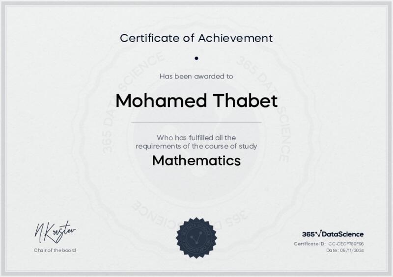 This user has been awarded the Mathematics Certificate for successfully completing the course exam. Holding this certificate demonstrates their proficiency on the topic and signifies they are qualified to apply their newly acquired expertise in the fields of data analytics and data science.