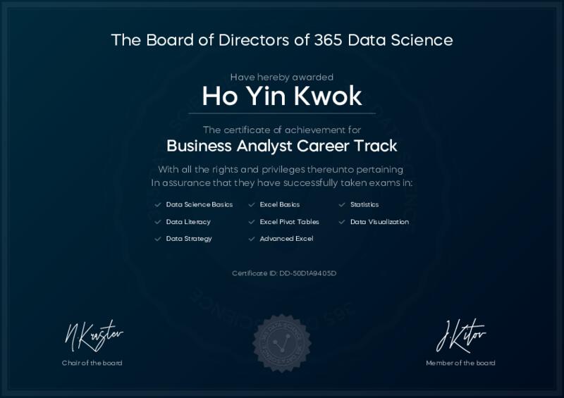 This user has been awarded the Business Analyst Career Track Certificate for successfully completing all courses and assessments. This certificate confirms their technical expertise and professional credibility to work as a business analyst.