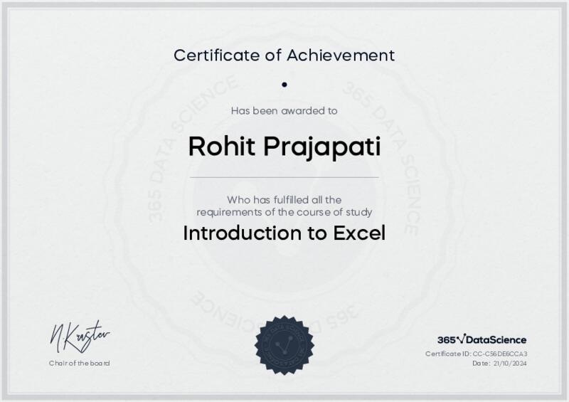 This user has been awarded the Introduction to Excel Certificate for successfully completing the course exam. Holding this certificate demonstrates their proficiency on the topic and signifies they are qualified to apply their newly acquired expertise in the fields of data analytics and data science.